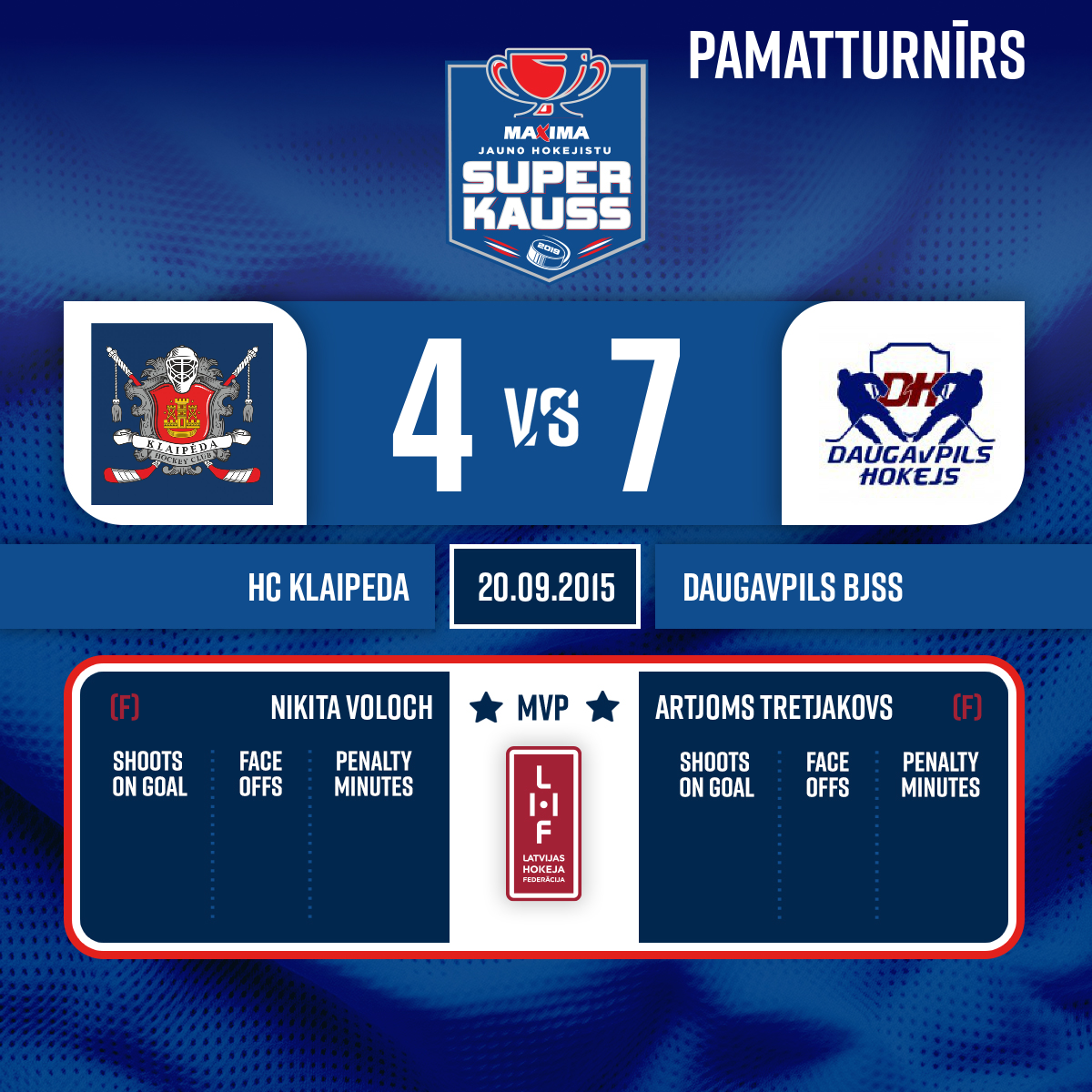 - 45:003.PSpēles labākie spēlētāji: HC Klaipeda - #92 Nikita Voloch, Daugavpols BJSS - #17 Artjoms Tretjakovs.