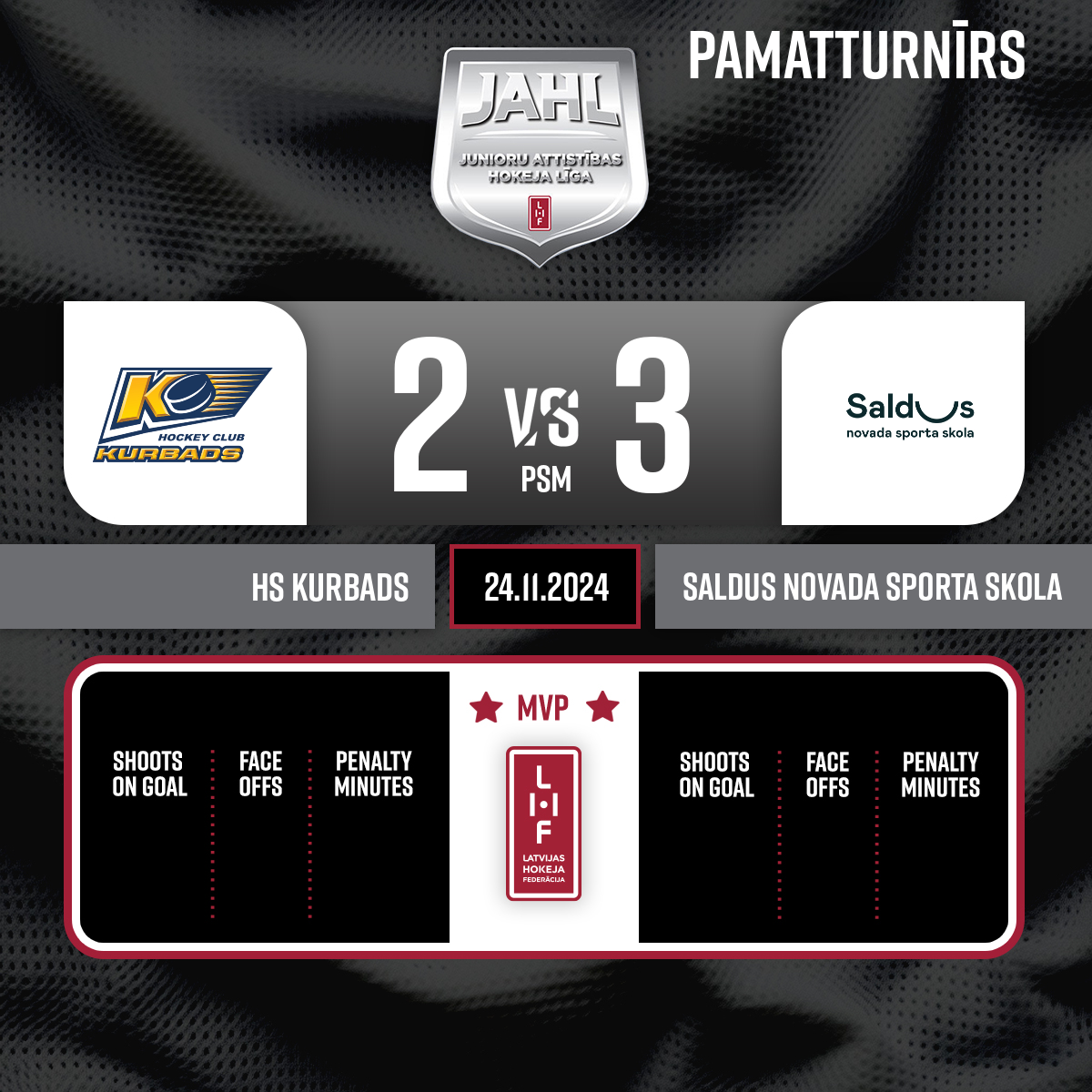 - 00:001.PSpēles tiesneši: galvenie tiesneši - Uldis Bušs un Edgars Lejnieks; līnijtiesneši - Reinis Mārtiņš Lejnieks un Renārs Davidonis Spēles sākums Kurbads ledus hallē pulksten 14:30