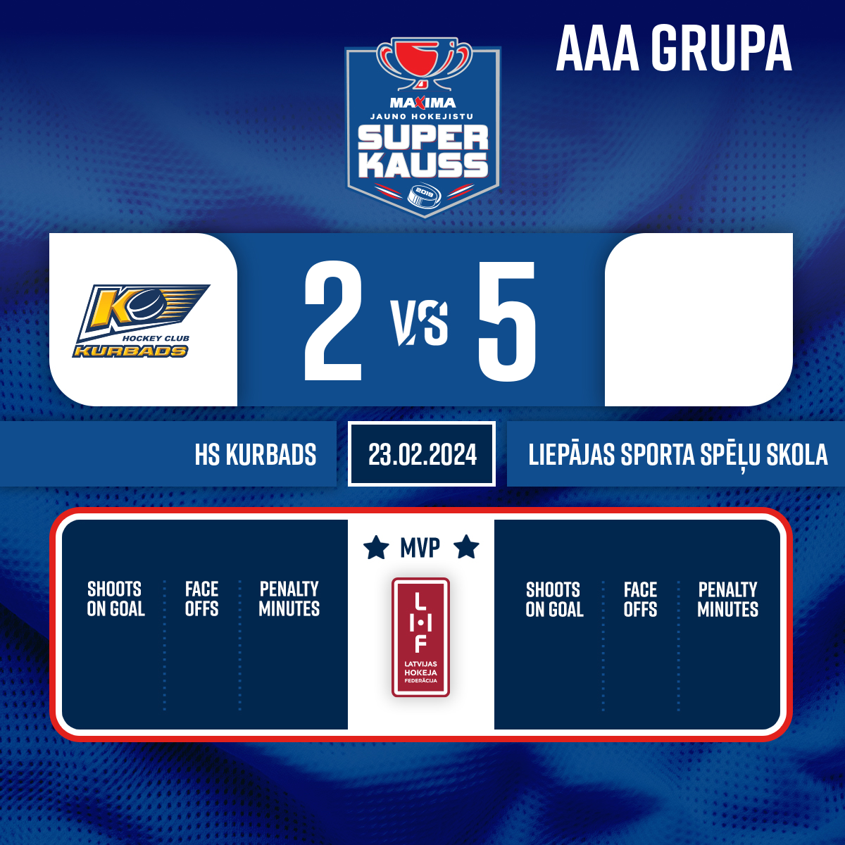 Vārti#13 Kristers KORBĀNSPiespēles: #77 Valdemārs PITKĒVIČS, #3 Markuss PASTARS - 54:133.PNoraidījums - 2 minūtesGrūdiens ar nūju rokās, #12 Savelijs BARANOVS
