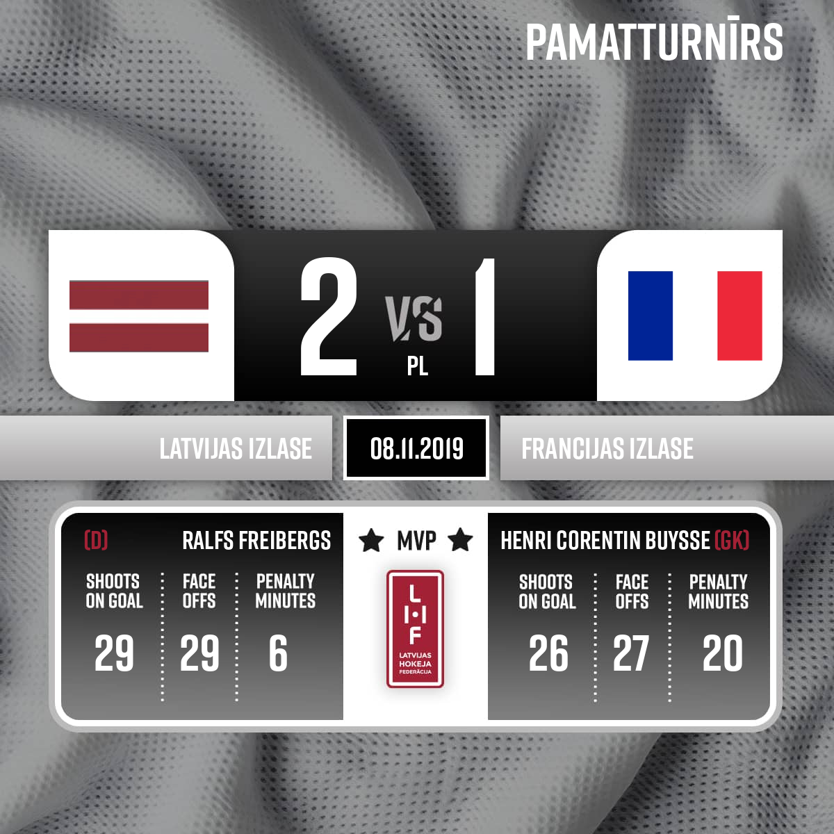 Labākais spēlētājs Latvijas izlasē / Best player from team Latvia # 29 Ralfs Freibergs. Labākais spēlētājs Francijas izlasē / Best player from team France # 35 Henri Corentin Buysse.