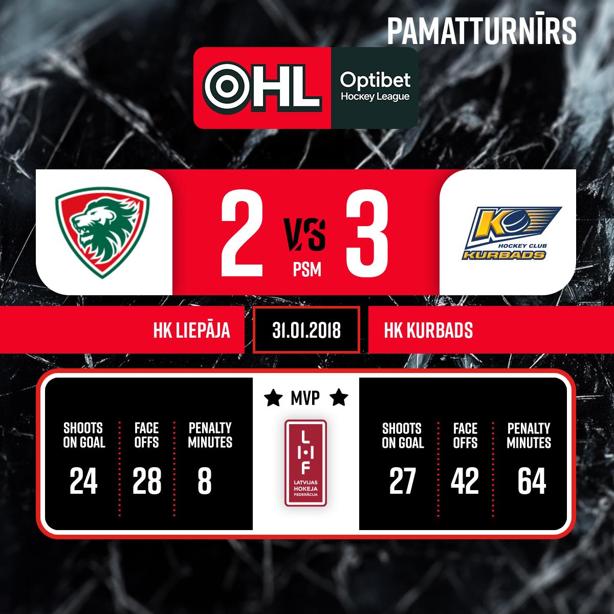 - 65:00PLSpēles labākie spēlētāji: HK KURBADS - Nr.30 Uldis Čalpa HK LIEPĀJA/OPTIBET - Nr.90 Reinis Demiters