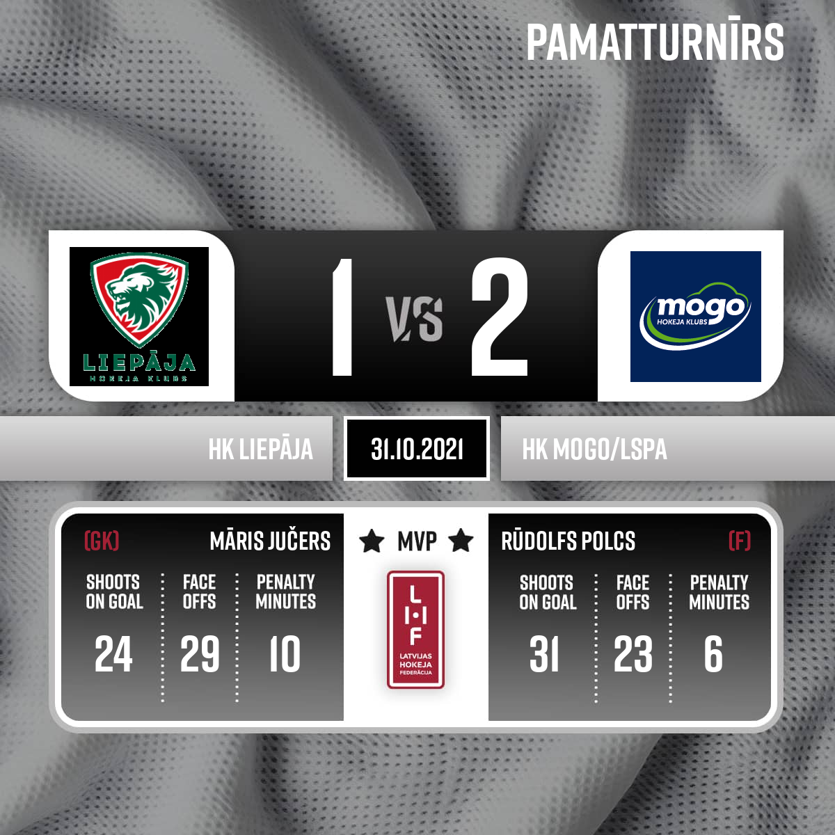 - 60:003.PLabākais spēlētājs HK Liepāja komandā nr. 35 Māris JUČERS / Best player for team Liepāka number 35 Māris JUČERS. Labākais spēlētājs HK Mogo LSPA komandā nr. 20 Rūdolfs POLCS / Best player for team Mogo / LSPA number 20 Rūdolfs POLCS.