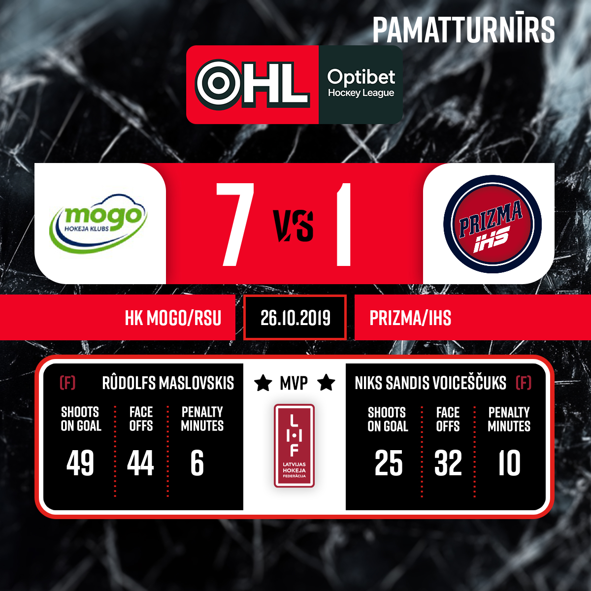 - 60:003.PSpēles labākie spēlētāji: HK Mogo - Rūdolfs Maslovskis #21 Prizma/IHS - Niks Sandis Voiceščuks #11