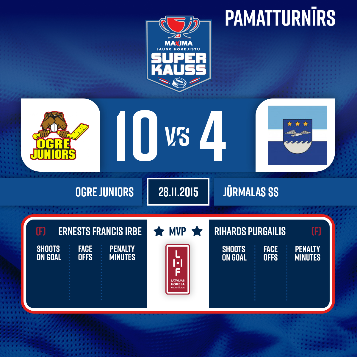 - 45:003.PSpēles labākie spēlētāji: Ogre juniors #21 Ernests Francis Irbe; Jūrmalas SS/EVHS #27 Rihards Purgailis.