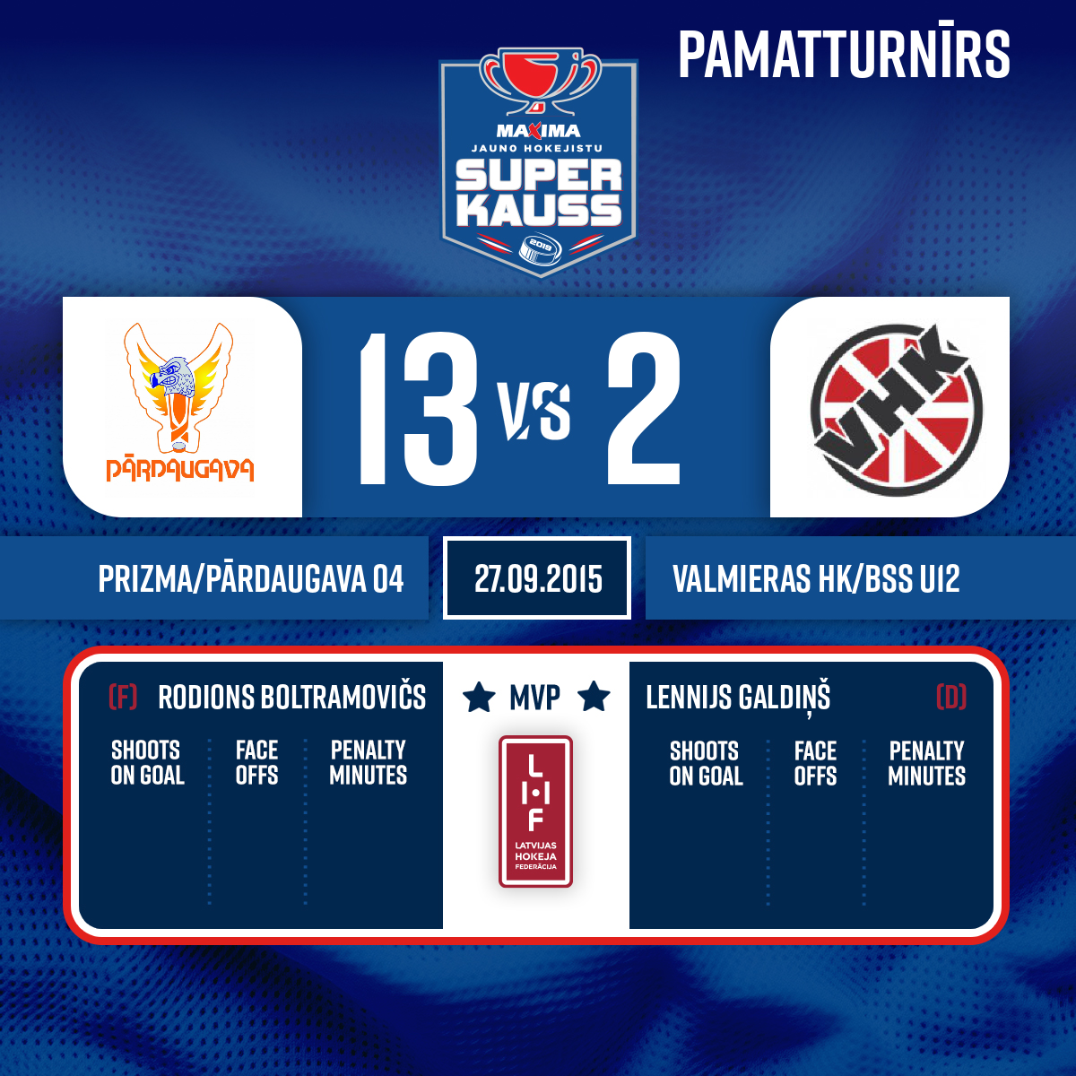 - 13:291.PVārti vairākumā#91 Kristers BUKŠSPiespēles: #33 Elvis LAŠKOVS, #88 Toms TROCKIS