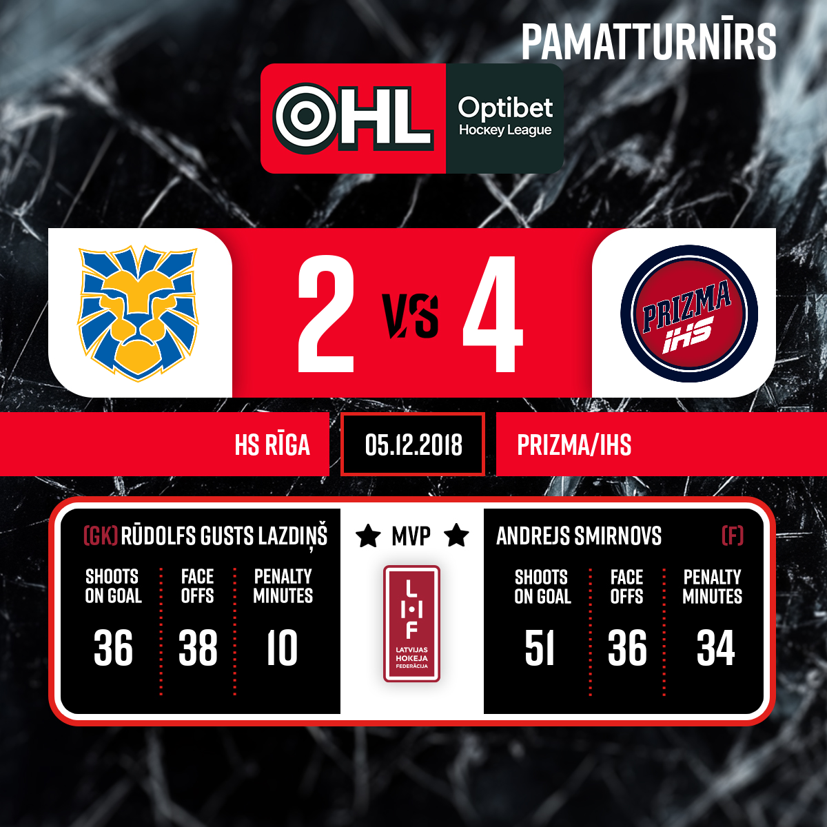 - 60:003.PSpēles labākie spēlētāji: HS Rīga Rūdolfs Gusts Lazdiņš #42 HK Prizma Andrejs Smirnovs #13
