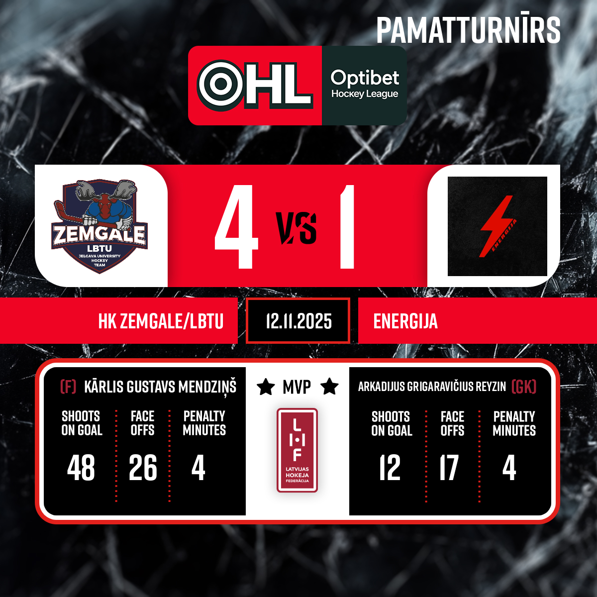 #15 Kārlis Gustavs MENDZIŅŠPiespēles: #12 Toms MOTS#16 Mārtiņš VĪTOLS1:123:11- 1. Periods