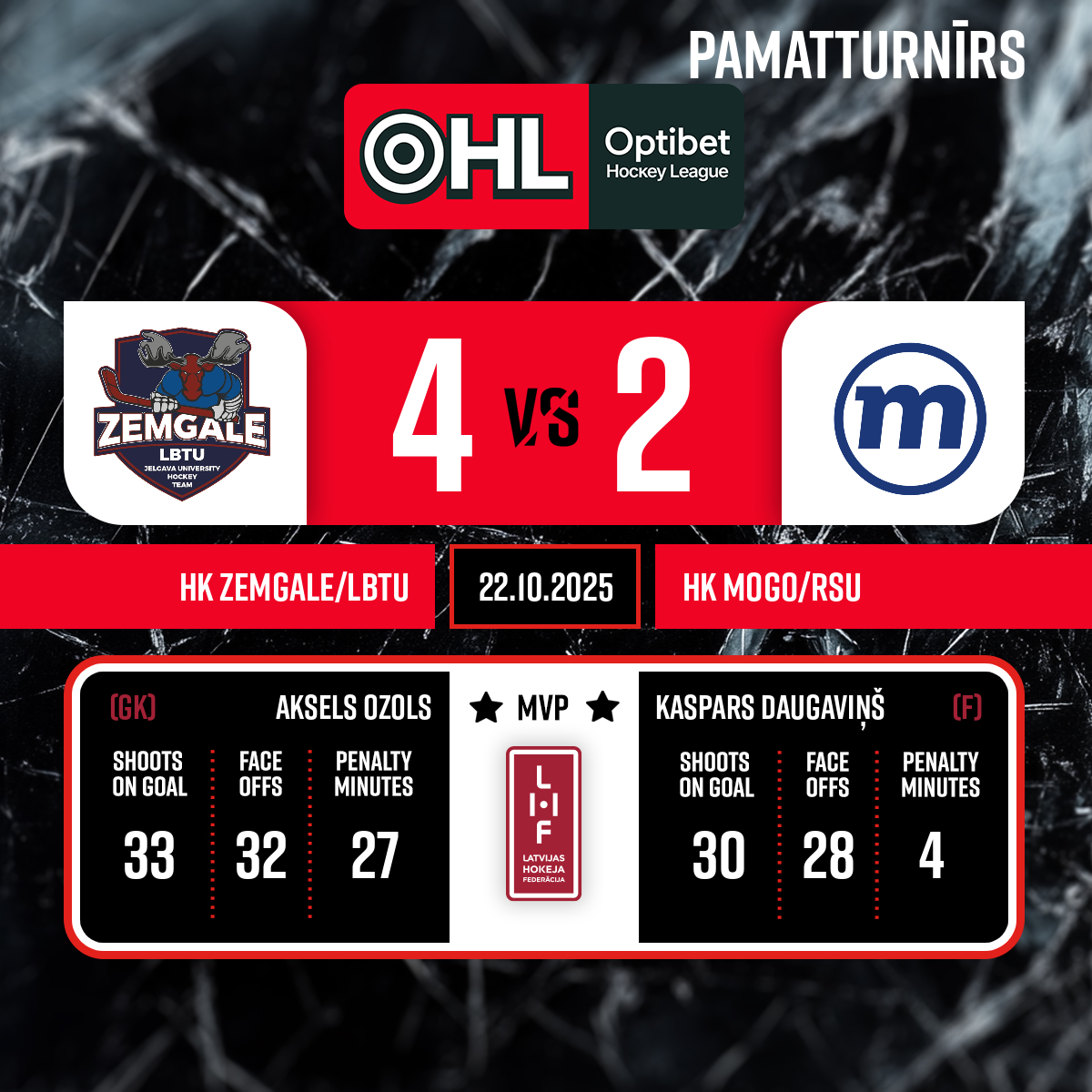 #7 Deivids SARKANISPiespēles: #29 Aleks Elians ĻEONOVS#16 Kaspars DAUGAVIŅŠ2:251:07- 2. Periods