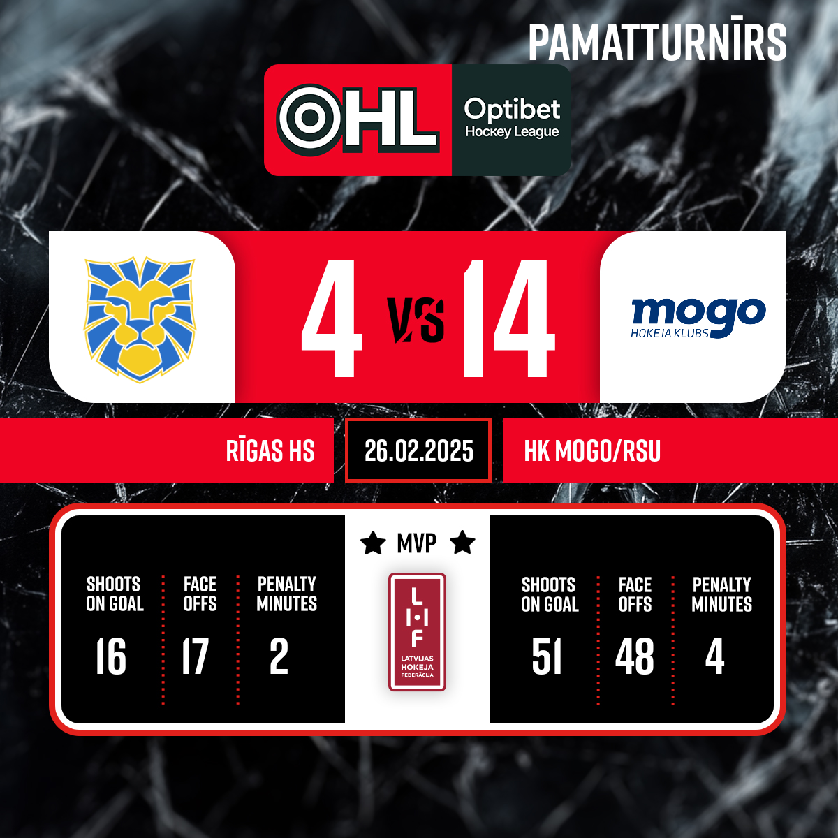Spēles labākie spēlētāji: RĪGAS HS komandā Nr. 58 MIHAILOVS Makss; HK MOGO/RSU komandā Nr. SOTNIEKS Kristaps